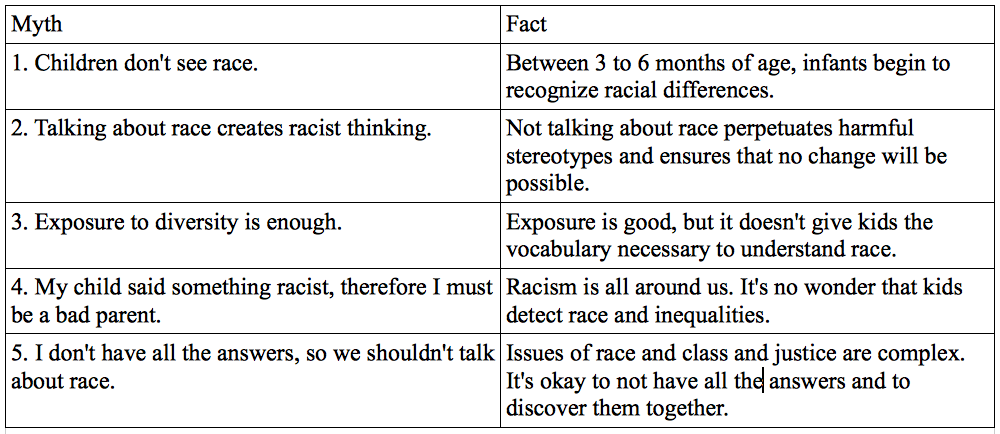 Race is a hard topic for many to talk about, especially with children. Some fear that they will spoil their kid’s innocence or even that talking about race will instill racism in their children. In Gina Parker Collins article, “Five Myths of Talking About Race With Your Child,” she dissects these common myths and provides alternative discussion starters. Read the article here: http://4riise.org/?p=424