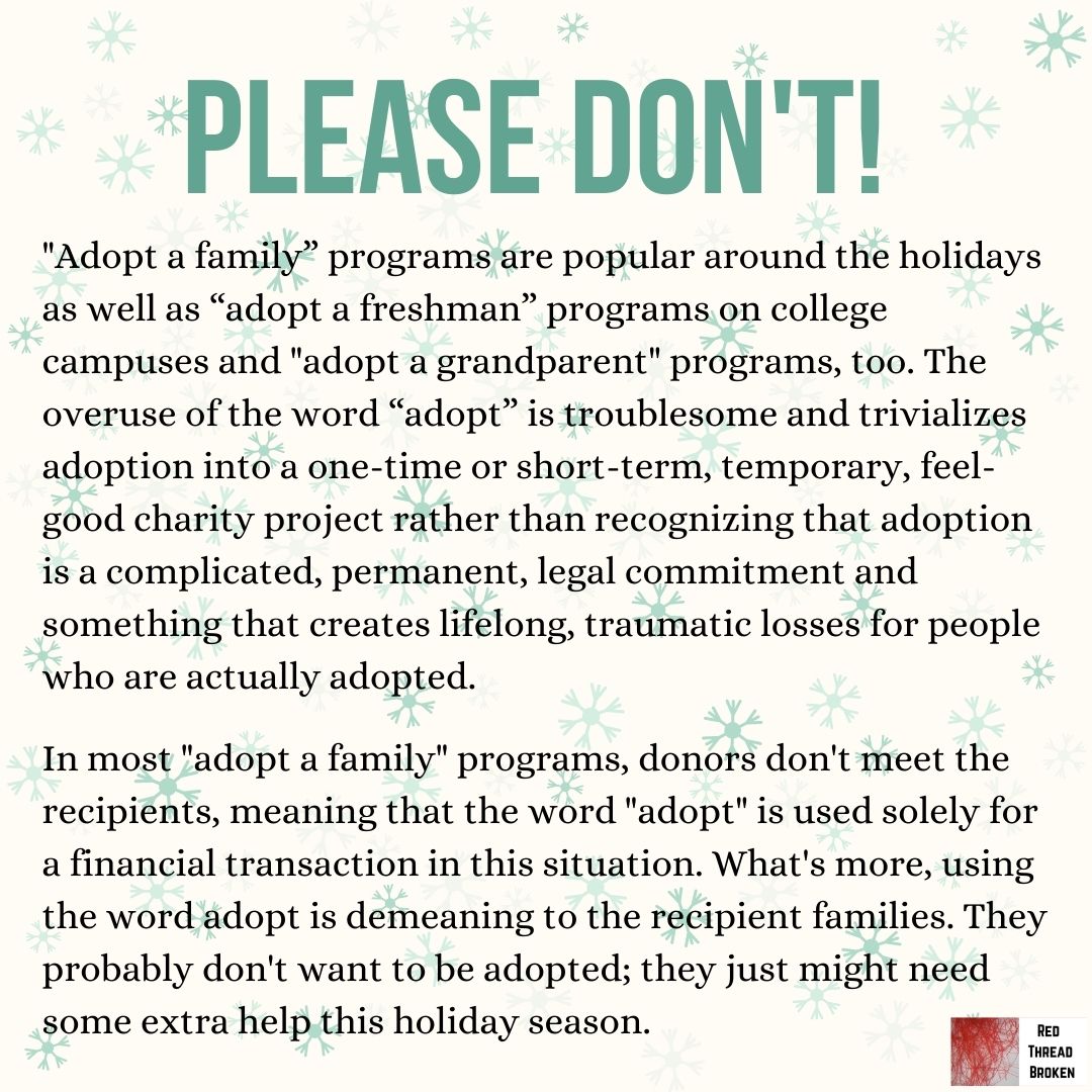 The text from the images below reads: “So you want to adopt a family this Christmas… Please don’t! “Adopt a family” programs are popular around the holidays as well as “adopt a freshman” programs on college campuses and “adopt a grandparent” programs, too. The overuse of the word “adopt” is troublesome and trivializes adoption into a one-time or short-term, temporary, feel-good charity project rather than recognizing that adoption is a complicated, permanent, legal commitment and something that creates lifelong, traumatic losses for people who are actually adopted.