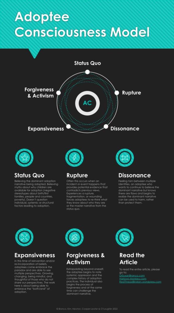 It has been such a pleasure working with fellow adoptees JaeRan Kim (Harlow’s Monkey), Susan Branco, Stephanie Kripa Cooper-Lewter, and Paula O’Loughlin on this model. In writing this work, we were intentional about drawing from the work of other scholar-activists of color and adoptees. We also elected to self-publish this paper, so that you all could access it from each our websites rather than putting it behind a paywall, restricted to only those with university access.