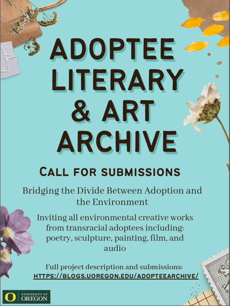 Adoptee Literary and Art Archive is a digital archive which aims to begin a conversation surrounding the intersections of transracial adoption, art, and environment. It argues that transracial adoptee environmentalisms are essential for just futures.